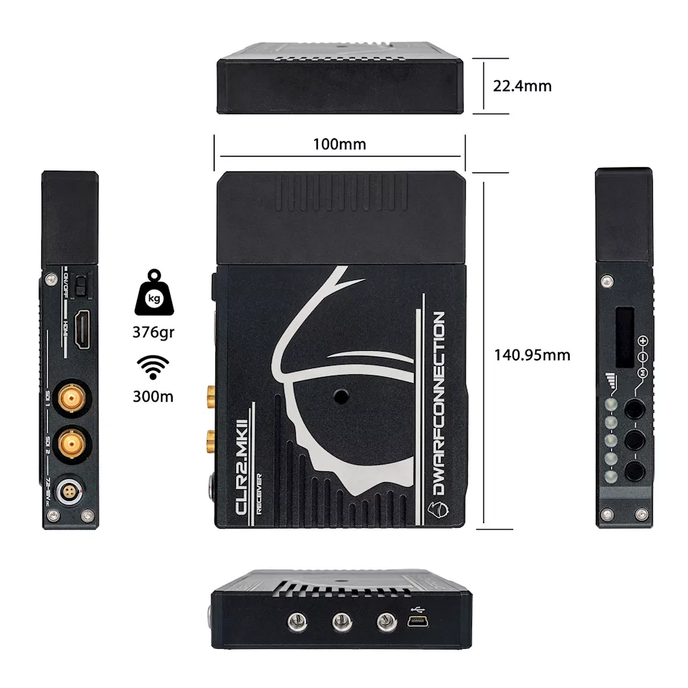 To find the optimal channel, the CLR2 MKII has a frequency scanner and an antenna function monitor, the DC-SCAN, which can be output via the HDMI port on the receiver. The wireless transmission of video signals and the frequency monitor can be used alternately. Like all non-DFS systems of the DC-LINK family, the CLR2 MKII is compatible to all WHDI predecessor systems as well as to all other, larger systems and can be extended with further DwarfConnection receivers as desired. All receivers of the MKII series have different frequency sets to receive video signals from other manufacturers with non-DFS WHDI. Thus, all new DC Link receivers can be added to an existing WHDI system from other manufacturers.