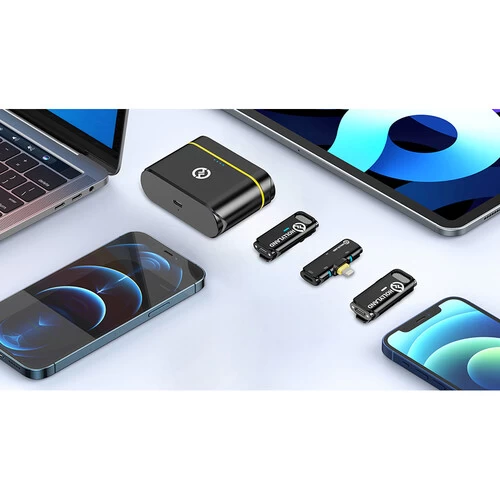 - Wireless microphone system allows you to record two on-camera personalities at once to your Lightning-enabled iOS device