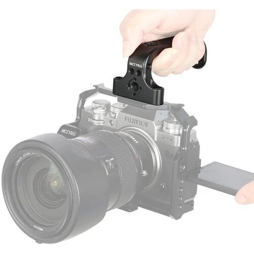 The versatile Top Handle with Dual 1/4″-20 Screw Mount from Niceyrig quickly mounts onto your cage or rig using two 1/4″-20 screws to provide a balanced gripping point for your small, lightweight digital camera or camcorder. The two mounting screws can be adjusted to fit onto your cage within a range of 1.4 to 1.9″ wide.