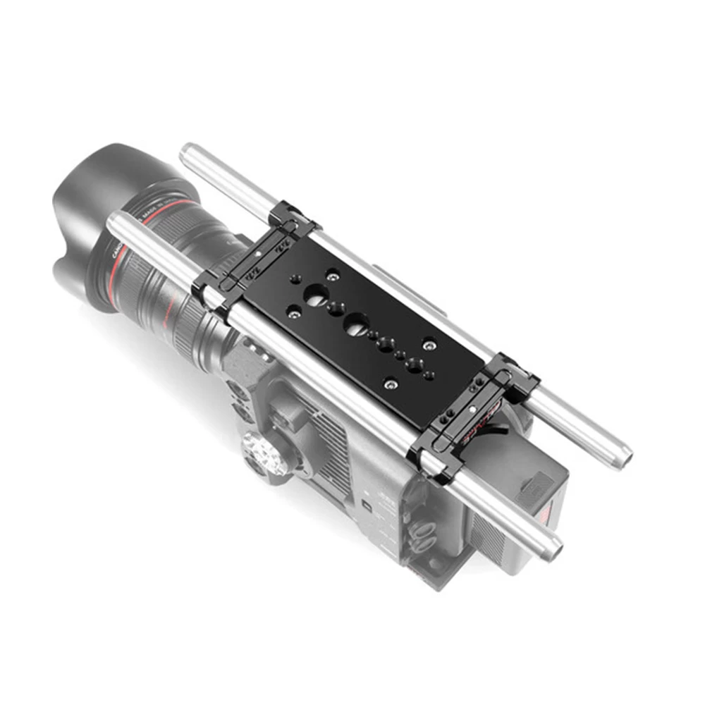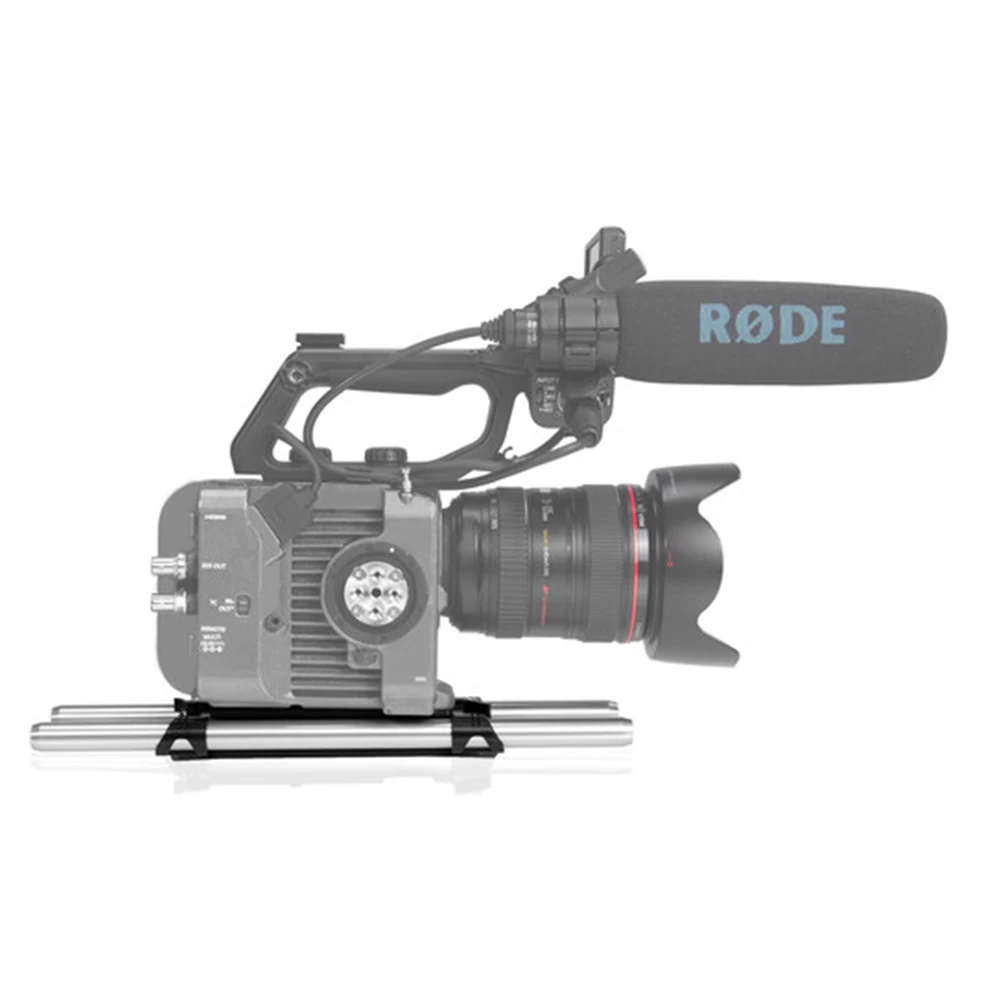 The lightweight baseplate with a 15 mm rod system is designed to match the Sony FX6 optical center. It features two attachment points (1/4-20 and 3/8-16) for securely mounting the Sony FX6 body. The baseplate also comes with a pair of 15 mm rods that are 12” long through the length of the baseplate. The bottom of the plate features several 1/4″-20 and 3/8″-16 mounting holes for mounting and balancing your camera on equipment like a tripod.