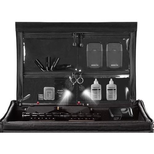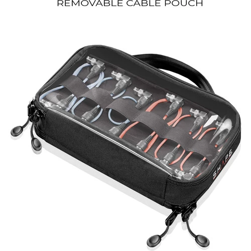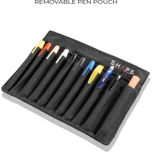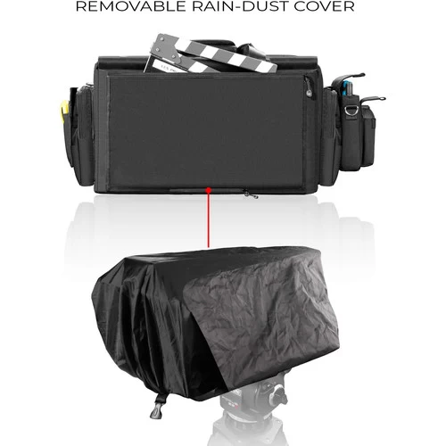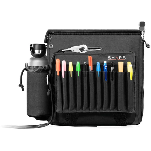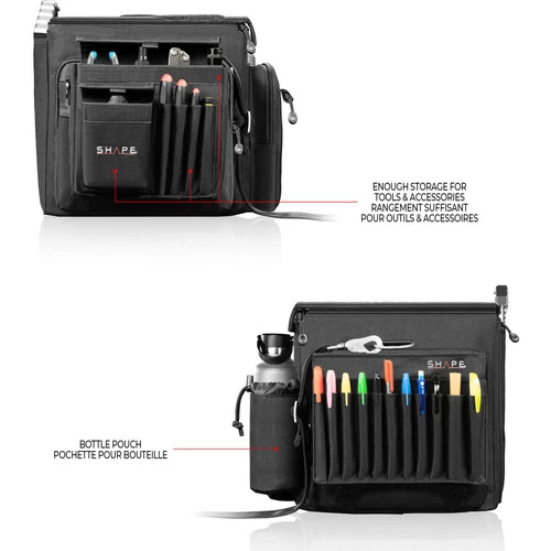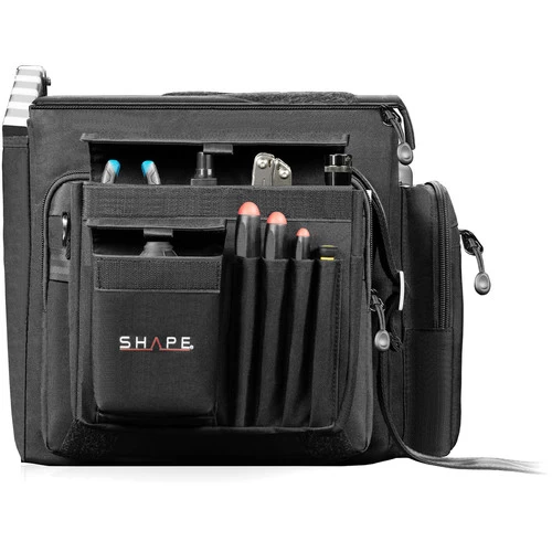 The SHAPE Black Camera Bag with Removable Pouches offers organized storage for video cameras up to 20″ in length and various accessories. With a 36-liter capacity, it includes three removable pouches equipped with MOLLE straps for convenient storage of tools, cables, and pens. The exterior design features a silent magnetic lid, dual zippered front pockets, a slate/flag pocket, a bottle holder for canned air, and hook-and-loop surfaces for easy labeling.