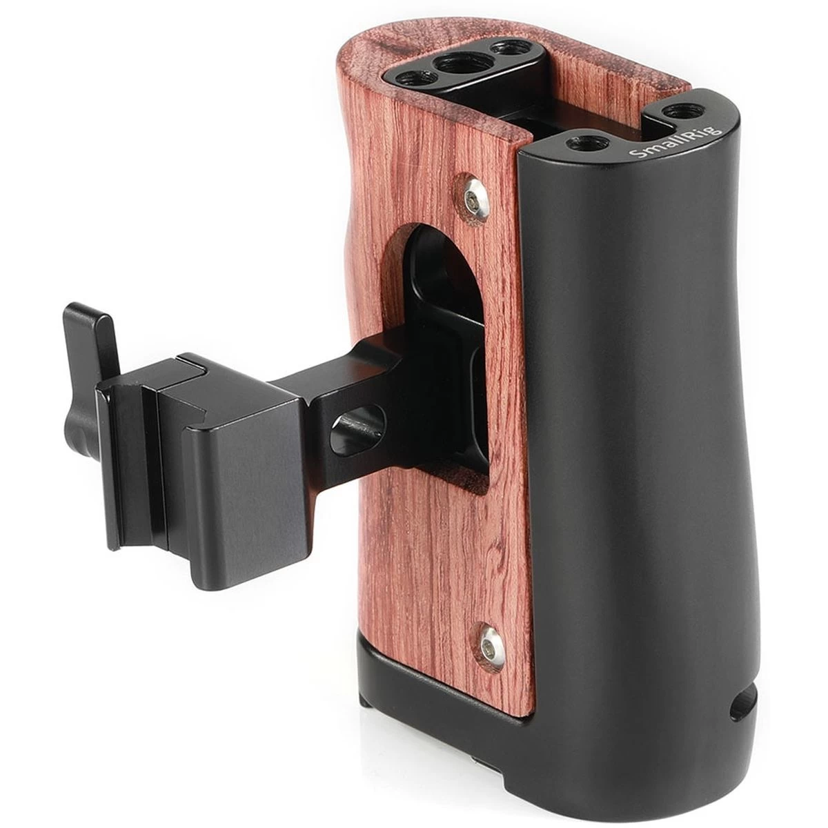 The SmallRig 2270 NATO Handle for BMPCC 4K and Samsung T5 SSD is a comfortable wooden handle, which can attach directly to the left NATO rail on SmallRig BMPCC 4K & 6K Cage 2203, 2254 and2255, and Z CAM E2 cage 2264. It is switchable to be used on both left and right hands. The handle leaves space inside to accommodate the Samsung T5 SSD, protecting the SSD drive and making the camera rig more compact. Also the anti-off lock on the bottom prevents accidental dropping of the SSD. Simply put the SSD into the handle from the bottom, securely lock it by a knob screw; the wire is plugged in from the top. On the top of the handle are 1/4’’-20 and 3/8’’-16 threaded holes where accessories like SmallRig Monitor Mount 1842, SmallRig Cold Shoe 1960 and 2260 can be attached.