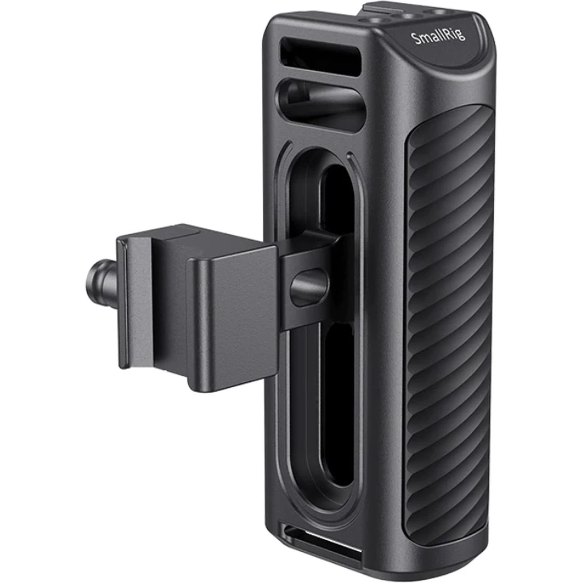 The Aluminum Side Handle from SmallRig provides a secure grip for your NATO rail-equipped camera or camera cage. This aluminum handle can be configured for right- or left-side use and slides up and down for optimal positioning. The top of the handle features three 1/4″-20 threads and one cold shoe mount for adding a light, microphone, monitor, mounting arm, or other accessory.