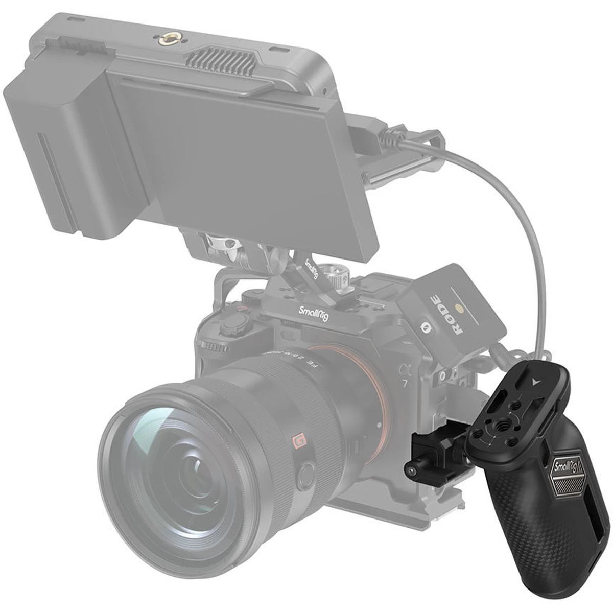 SmallRig Universal Rotating NATO Side Handle 3847 is designed to assist with camera movement and enhance shooting stability. Made of strong, lightweight magnesium alloy and carbon fiber, this handle can rotate 360 degrees during filming via the unlock button and fits the left or right hand with its ergonomic design. It comes with such accessory mounting points as a cold shoe mount on the top for Monitor Mount 2905B, microphone, LED light, etc.; an ARRI 3/8″-16 locating hole for Monitor Mount 2903B; three 1/4″-20 threaded holes for Magic Arm 2070B, Magic Arm with Small Ball Head 2157, etc.; and a strap hole for Hand Strap 3848 for more stability. A magnetic spanner is included at the bottom for easy access. Also, in the box, there is a NATO rail for you to mount the handle onto cages without NATO rail on both sides.