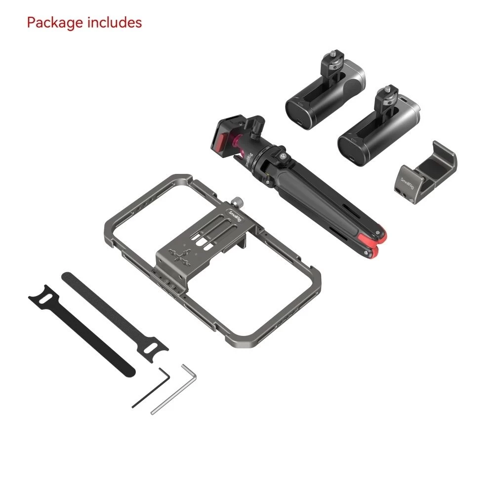 SmallRig All-in-One Video Kit Pro (2022) 4120 represents a professional solution to smartphone vlogging and live streaming. The kit includes a universal phone cage, a wireless control side handle, a quick-release tripod, a power bank holder, among other things. Particularly, the handle facilitates on / off control of shooting and recording to improve efficiency and experience; the tripod allows quick switch between handheld mode and tripod mode, and features a larger opening diameter for more stability; the power bank holder connects external batteries for prolonged operating time. Moreover, 1/4”-20 threaded holes and cold shoe mounts support a mix of accessories, hence more creativity and fun for video creators.