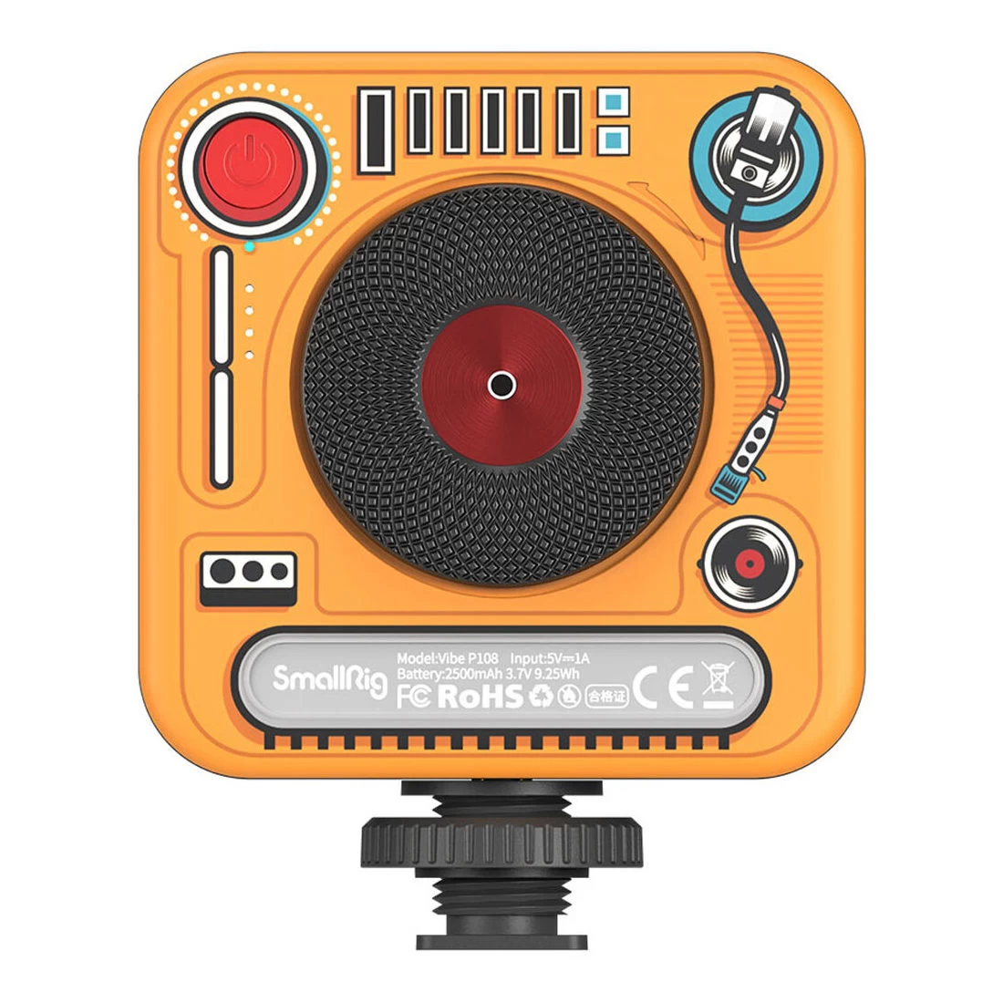 SmallRig Vibe P108 (“Phonograph” Limited Edition) is one portable, fashionable mini full-color light following the Vibe P96 dual-color temperature video light. The ID and unique compass knob design still continue on this version, and also in terms of light source and battery life. The actual usage scenarios have been upgraded. In terms of optical parameters, this lamp consists of 108 high-quality lamp beads, including 28 RGB lamp beads, 40+40 cold and warm lamp beads, CRI ≥ 95, and a color temperature range of 2700K-6500K. The fill light has a built-in 2500mAh lithium battery, which is charged through the included USB Type-C charging cable and supports a dual-C port charging solution. When the battery is fully charged, the maximum power can last for 130 minutes of usage. This light can be directly connected to the camera or mobile phone expansion frame through the built-in standard cold shoe interface. In addition, you can also use the cold shoe seat on the side of the fuselage for splicing or expansion. It is a pocket portable full-color fill light with strong playability and performance.