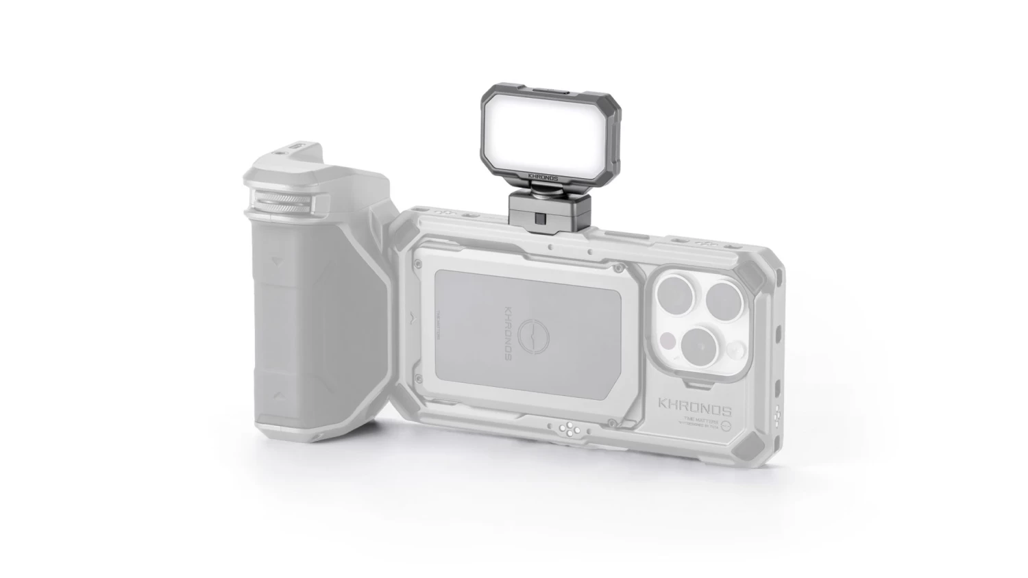 Designed for the Khronos Ecosystem, the Khronos Mini Daylight LED Light Panel in space gray by Tilta features a unique locking clamp mechanism for seamless attachment to Khronos cases for the iPhone 15 Pro and Pro Max. Measuring a compact 2.6 x 4.4 x 1 inches and weighing just half a pound, this light panel provides three levels of brightness and boasts a CRI rating of 95, ensuring excellent color accuracy for diverse shooting conditions. The panel can tilt 30° vertically and rotate up to 350° horizontally, offering versatile lighting options.