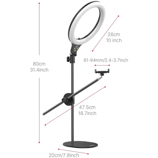 This LED ringlight provides light in three modes: cold, neutral and warm. This allows you to take beautiful, bright photos and videos in all lighting conditions. The 10-inch ring lamp spreads the light evenly over your face or object which reduces shadows.