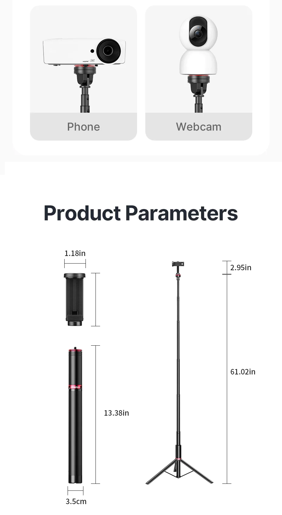 The Ulanzi MT-54 selfie stick tripod offers extendable functionality, ranging from 35 cm to an impressive maximum of 150 cm. Crafted from a combination of plastic and metal, it provides a sturdy build for reliable support. Anti-slip rubber on the legs enhances stability, while its collapsible design ensures convenient portability at just 35 centimeters when folded.