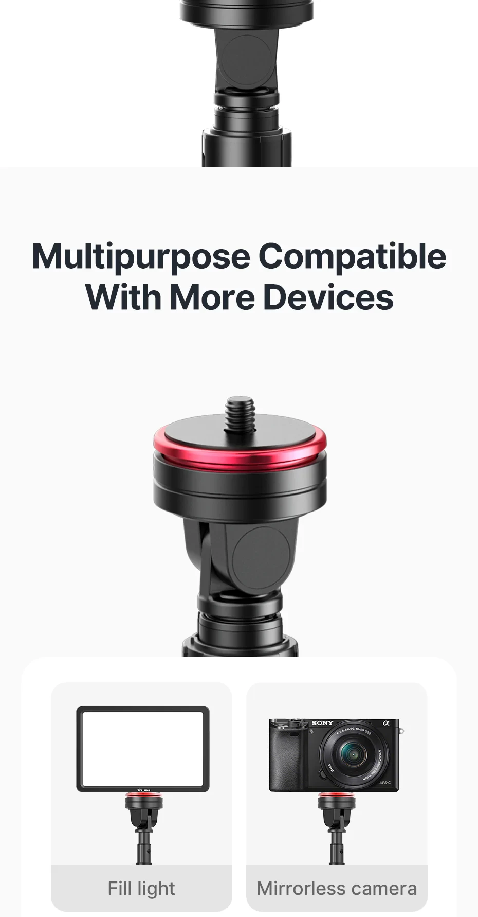 The selfie stick tripod features a collapsible phone holder, leaving a 1/4 inch screw exposed for mounting cameras or GoPro holders when folded. Its adjustable tripod head notch enables both vertical and horizontal filming, accommodating smartphones, compact cameras, or action cams for optimal positioning.