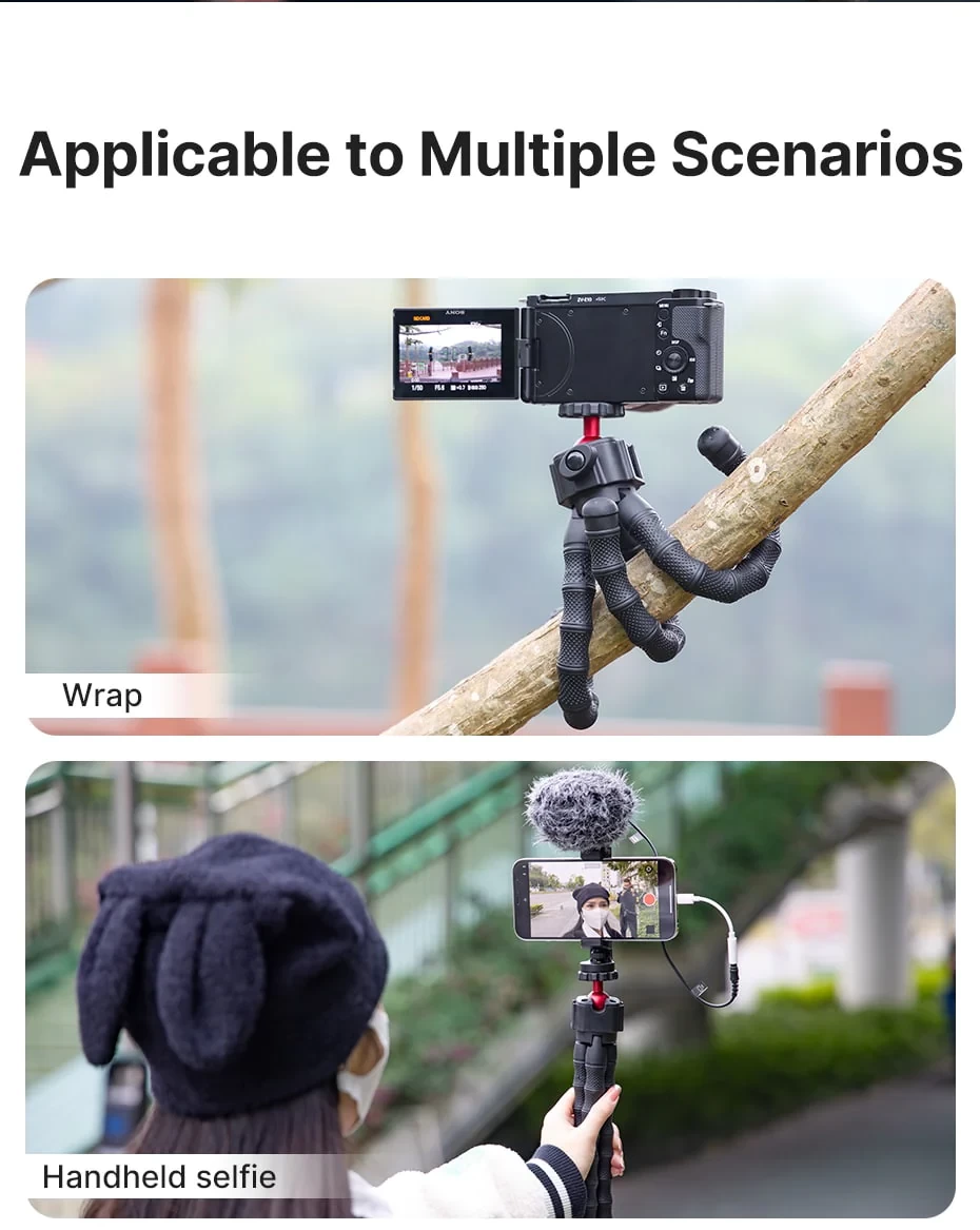 The Ulanzi MT-52 flexible tripod from the vlog kit has two flexible arms. This allows you to place your compact camera, system camera, DSLR camera, smartphone or GoPro wherever you want. Easily attach the flexible legs to a pipe, tree branch or fence. The arms are 20.5 cm long, can be moved in all directions and can bear a maximum weight of 500 grams.