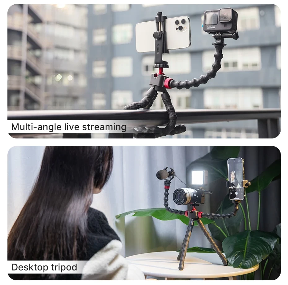 The Ulanzi ST-17 is a rotatable phone clamp, with which you can place your smartphone in any desired angle. Clamp your phone with the sturdy spring. Attach the phone holder to the tripod with the 1/4″ screw hole. At the top of the phone holder is a cold shoe mount, with which you can connect the microphone, LED lamp or other accessory.