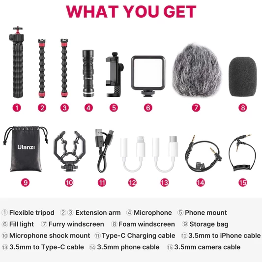 - Package contents Tripod, phone holder, microphone, microphone cables (for smartphone and camera), pop shield, wind screen, LED lamp, charging cable, USB-C to mini-jack and Apple Lightning to mini-jack adapter, microphone and lamp manuals